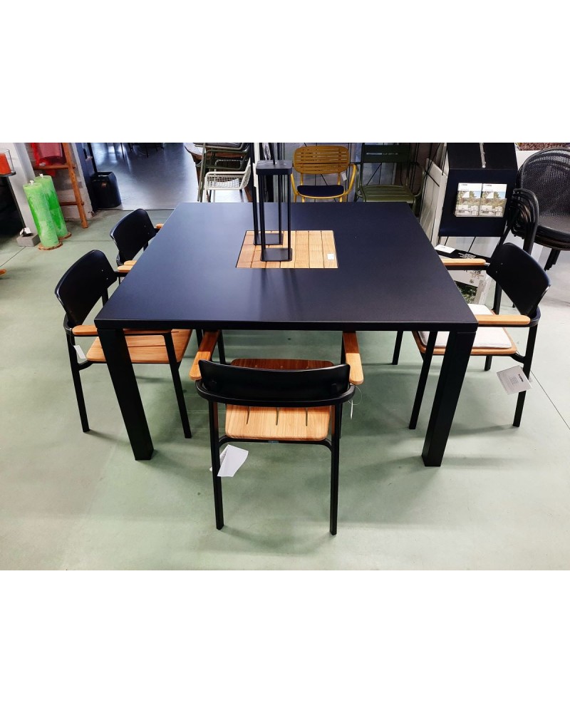 1 x tafel Quadro van 140x140 cm in zwart metaal met een teak inlegblad in het midden